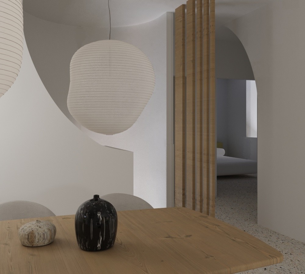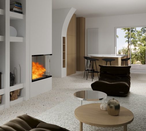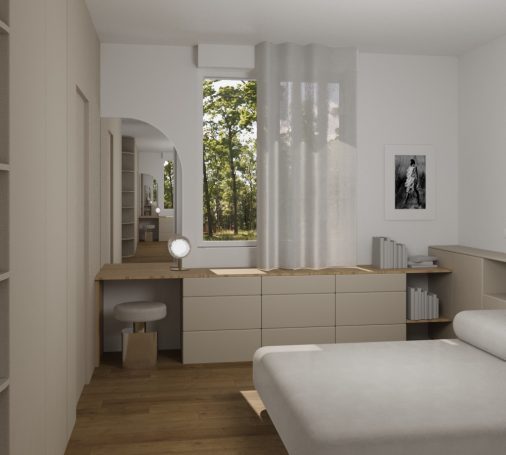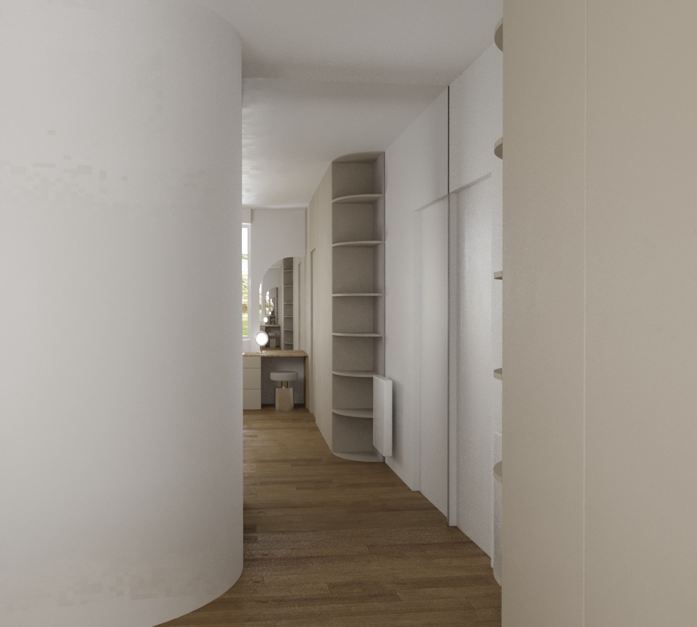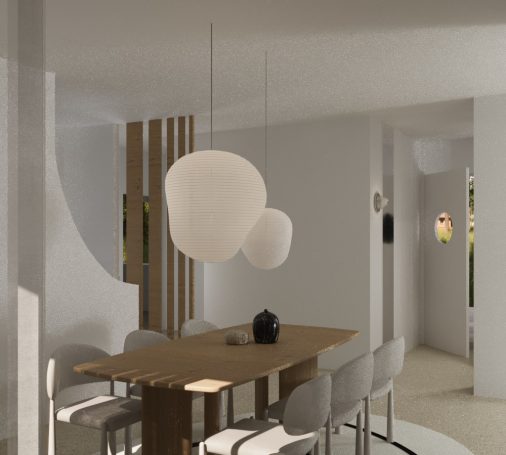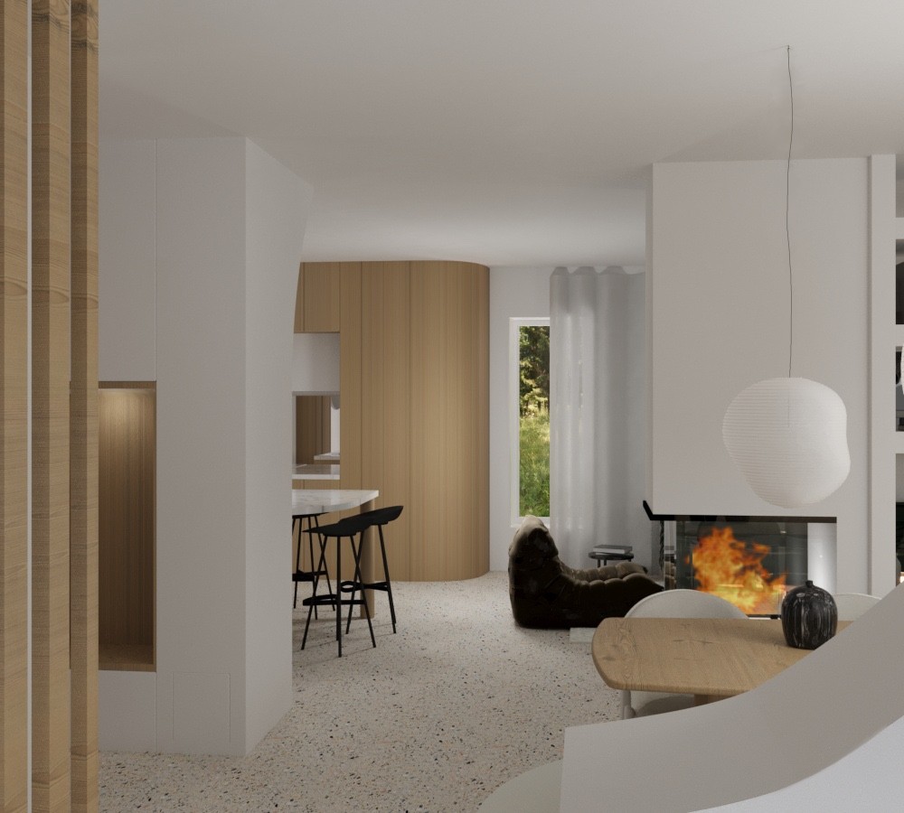Courbes et arches sont utilisés ici pour moderniser cette maison des années 70 en conservant son son style. L’utilisation de la courbe offre une meilleure circulation de la lumière, davantage de fluidité de circulation et permet d’apporter de la légèreté à l’ensemble.